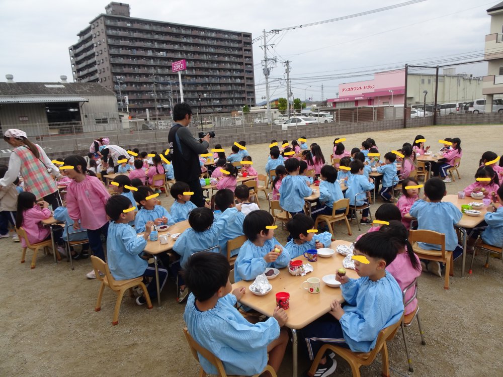 給食は園庭で食べましたが、自分たちの千切ったお野菜やお肉がたっぷり入った豚汁はどの子も沢山おかわりをしました。