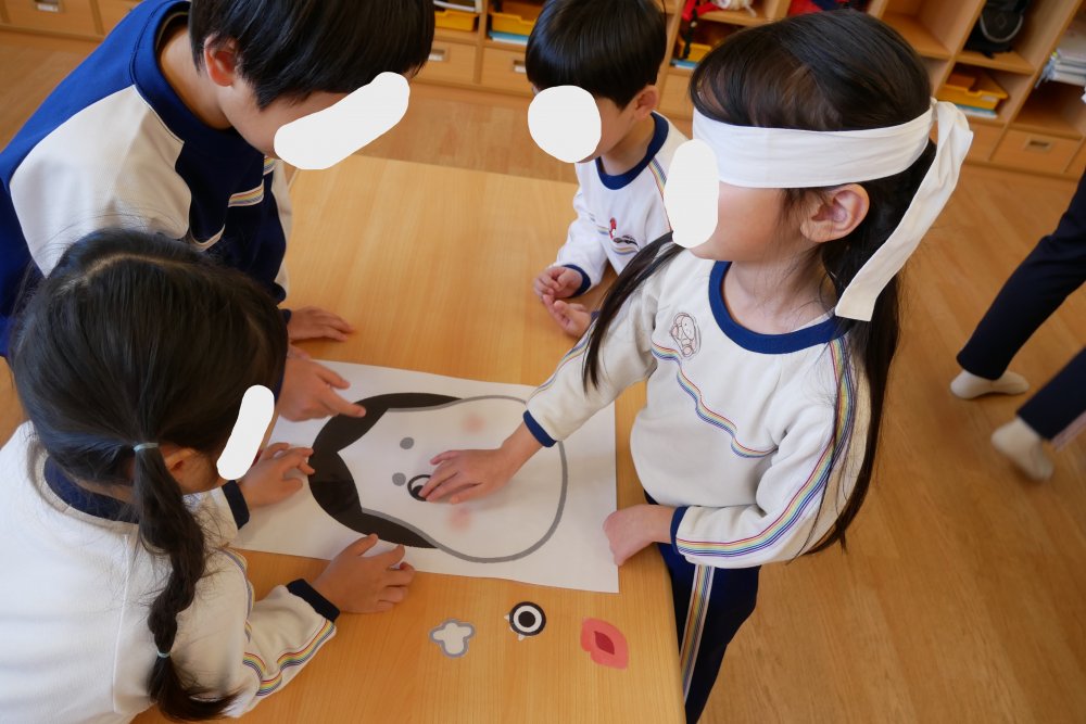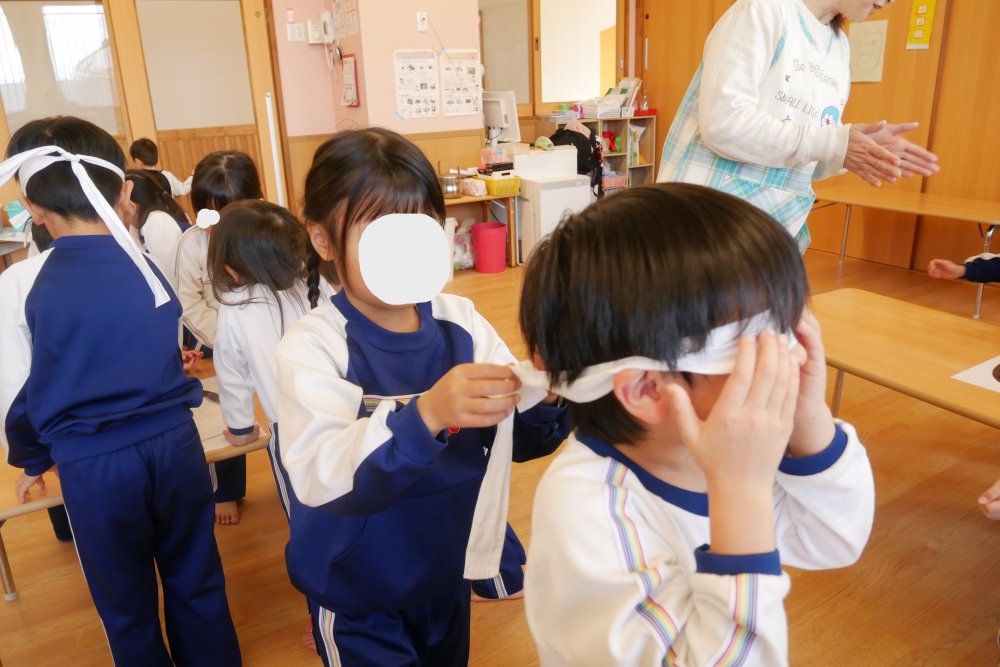 目隠しを、お友だちにつけてあげたりと、子どもたち同士の思いやりや、優しい姿が見られた