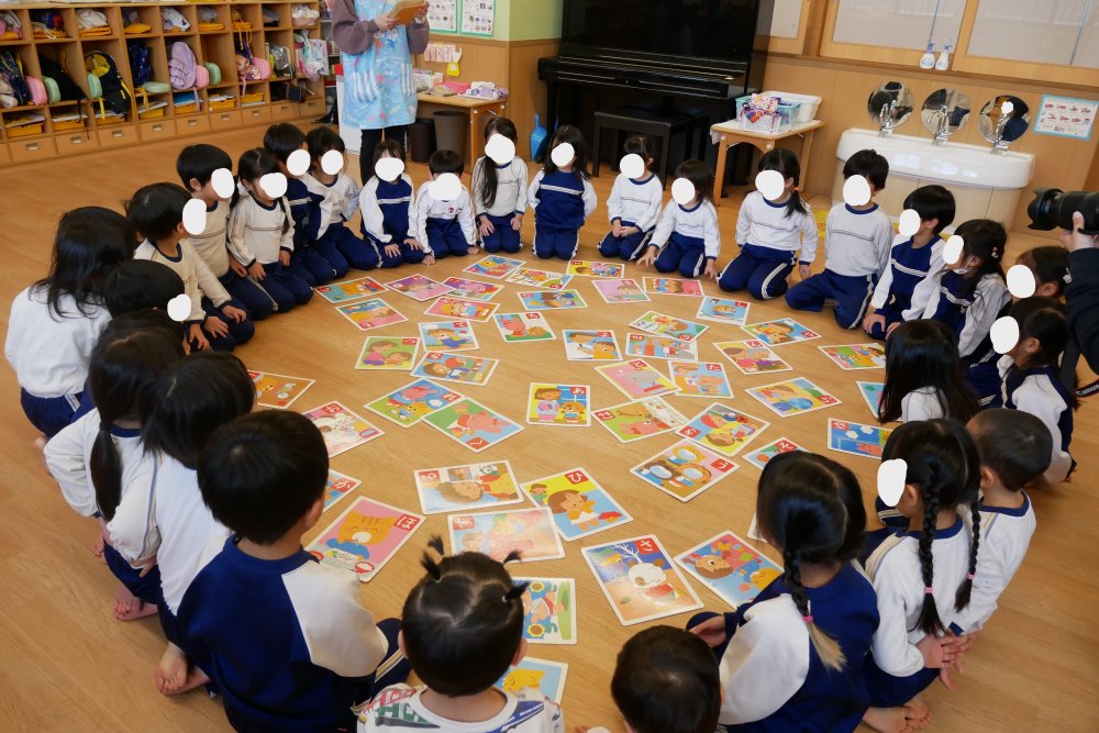 3.4.5歳児の縦割りで、各クラスに用意されている、大きいかるた、